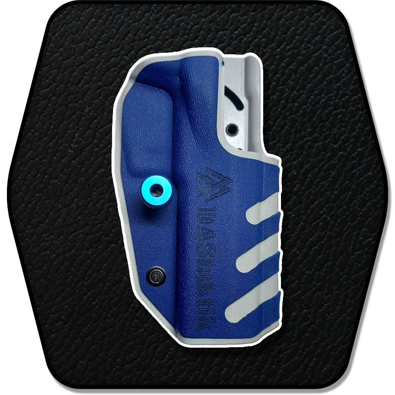Funda Delta PRO combinada en 2 colores (azul y gris), doble placa de kydex (1,5mm+2mm) y tornillo para regulación rápida. Producto que ofrece una amplia gama de accesorios de fijación que lo vuelven sumamente versátil, ajustándose a las necesidades de cada usuario.